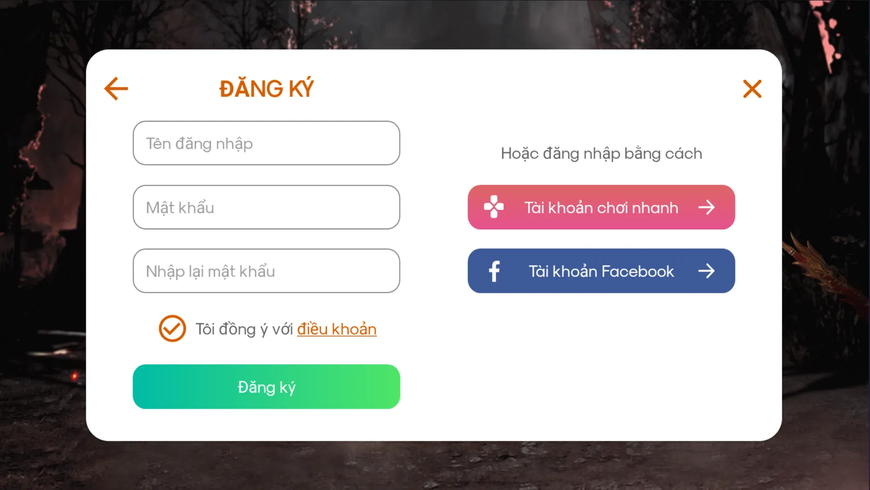 Bước 2: Tại giao diện đăng ký: Nhập thông tin tài khoản và mật khẩu và email và bấm nút "Đăng Ký" để hoàn tất.